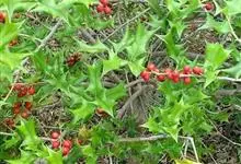 构骨叶冬青学名枸骨,又名猫儿刺、老虎刺、八角刺、鸟不宿、构骨、狗骨刺、猫儿香和老鼠树。常绿灌木或小乔木,高1-3米,二年枝褐色,三年生枝灰白色,叶片厚革质,花淡黄色,果球形,直径8-10毫米,成熟时…全部>>