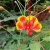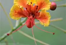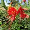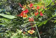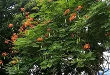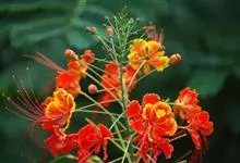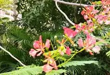 洋金凤 Sw.),豆科小凤花属灌木状或小乔木植物,枝无毛,绿或粉绿色;二回羽状复叶;总状花序伞房状,萼片无毛,花瓣橙红或黄色,圆形,花丝红色,子房无毛,花柱橙黄色;荚果窄而薄,…全部>>