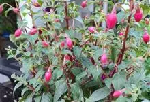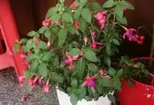 倒挂金钟是柳叶菜科倒挂金钟属亚灌木植物。茎直立,多分枝;幼枝带红色,被短柔毛与腺毛,老时渐无毛;叶对生,卵形或窄卵形,脉常带红色;常带红色,被短柔毛与腺毛;花筒红色,筒状钟形,…全部>>