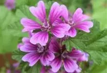 锦葵:二年生或多年生直立草本,高50-90厘米,分枝多,疏被粗毛。叶圆心形或肾形,具5-7圆齿状钝裂片,两面均无毛或仅脉上疏被短糙伏毛。花3-11朵簇生,小苞片3,长圆形疏被柔毛;花紫红色或白色,…全部>>