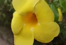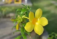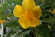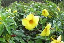 大花软枝黄蝉是软枝黄蝉的一个变种,夹竹桃科黄蝉属植物。藤状灌木,长达4米,枝条软弯垂,具白色乳汁。叶纸质,椭圆形、卵圆形或倒卵形,花序着花4-5朵,花冠比原变种大形,橙黄色,花冠喉部具5个发亮的斑点…全部>>