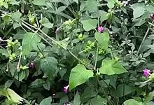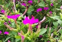 即紫茉莉,英文名:Four-o'clock,Marvel of Peru,为紫茉莉科、紫茉莉属多年生草本植物,一年生栽培。株高50~80cm。根粗壮,茎多分枝而散生。叶对生,卵形或心脏形。花数朵簇生…全部>>
