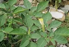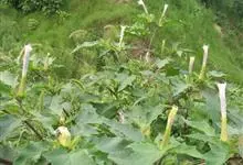 洋金花是茄科曼陀罗属植物,一年生草本植物,全株近于无毛。茎直立,圆柱形,高30~100cm,基部木质化,上部呈义状分枝。叶互生,上部的叶近于对生;叶柄长2~6cm,表面被疏短毛;叶片卵形、长卵形或心形,…全部>>