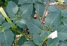曼陀罗,茄科曼陀罗属一年生大型草本植物,全株光滑。有臭气;叶呈广卯形,边缘具不规则波状浅齿裂;花单生于枝杖间或叶腋,直立,有短梗;花萼是筒状裂片三角形,颜色为白色或淡紫色;果实为蒴果卵状,…全部>>