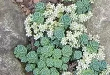 子持莲华 Hara)是景天科瓦松属多年生肉质草本植物。茎葡富,可萌生侧芽、易群生,叶片呈半圆形或长卵形,排列如莲座状、蓝绿色,表面略有白粉,…全部>>