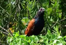 褐翅鸦鹃,是鹃形目鸦鹃科鸦鹃属的鸟类。褐翅鸦鹃的身体为黑色;头颈和胸带蓝紫色金属光泽并具黑亮的羽干纹,下胸至腹部泛金属绿光泽;两翼和肩部为棕栗色,外侧飞羽具暗色羽端,尾羽闪铜绿色光泽;虹膜赤红色,…全部>>