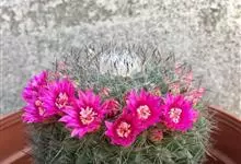 仙人掌科乳突球属原产墨西哥,通常单生,茎圆桶形,径粗9-10cm,高25-30cm,深绿色。棱13-21,放射刺20-30,中刺7-15,长2cm,红褐色。花色紫红。喜温暖干燥和阳光充足环境。较耐寒,…全部>>