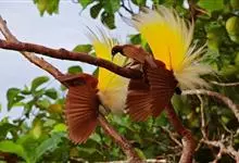 大极乐鸟是极乐鸟属中最大的鸟种。成年雄鸟体长可达到43厘米,雌性可达35厘米。雄鸟的额、颊、喉等墨绿色;头、颈黄色;上体暗赤栗色;腹部葡萄红色,胁部有长饰羽,其基部橙黄,中部黄色,…全部>>