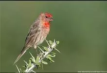普通朱雀是雀形目雀科朱雀属鸟类,又名红朱雀、马料、青麻料。雄鸟上体红色,下体淡红色;头部、喉部、胸部及腰部亮红色;背部褐色染红色;两翼及尾黑褐色,羽缘染红色。雌鸟上体橄榄褐色,下体近白色,…全部>>