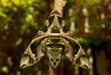 鬼脸天蛾,是鳞翅目天蛾科面形天蛾属动物。成虫翅展100~125毫米,体黑褐色;胸背有骷髅形斑纹;卵圆球形,直径约2毫米,淡黄绿色,表面光滑;老熟幼虫体长70~90毫米,蛹体长约56毫米;前翅为褐色,…全部>>