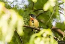 黄腹啄花鸟:体重11-16克,体长104-117毫米。是一种体型大,下腹部为艳黄色的啄花鸟,雄鸟特征为头黑色,喉部有白色纵斑、喉侧及上体成对比,两翅和尾黑色,外侧尾羽内翈具白色斑块。其余下体淡黄色。…全部>>