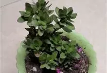 钱串景天景天科青锁龙属植物,多年生肉质草本,植株呈亚灌术状,植株小,节间短且几乎看不见节间,分枝平铺,在节上生根,对生的叶合生成圆盘状,叶顶端钝,花序为圆形聚伞圆锥花序,花白色。…全部>>
