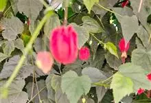 红萼苘麻是锦葵科、苘麻属常绿软木质灌木,叶绿色,长5-10厘米,心形,叶端尖,叶缘有钝锯齿,有时分裂,有细细的叶柄;叶互生,掌状叶脉;花单生于叶腋,具长梗,下垂;花萼红色,半套着大约4厘米长的花瓣,…全部>>