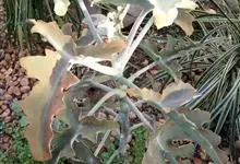 仙女之舞是景天科、伽蓝菜属植物。常绿肉质灌木,株高可达2-3米。幼株茎上有毛。叶有柄;单叶对生,阔卵状三角形,肉质;新叶开展,老叶正面凹、背面圆凸,缘具稀锯齿,橄榄绿色至灰绿色,被稠密的灰白色毛。…全部>>