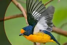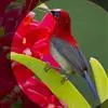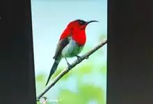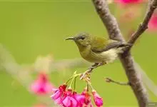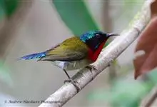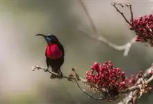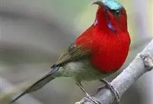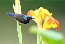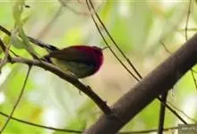 绿喉太阳鸟:共有9个亚种。小型鸟类,雄鸟体长13-15厘米、雌鸟10-12厘米。雄鸟前额至后颈、颏和喉辉绿色,头侧黑色,颈侧和背暗红色,两肩、下背橄榄绿色,腰鲜黄色,尾上覆羽和中央尾羽暗绿色,…全部>>