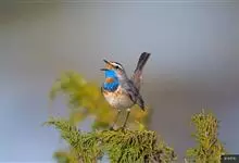 蓝点颏亦称“蓝喉歌鸲”,通称蓝靛颏儿。身体大小和麻雀相似,体长12-13厘米,体重17-18克。头部、上体主要为土褐色。眉纹白色。尾羽黑褐色,基部栗红色。颏部、喉部辉蓝色,下面有黑色横纹。下体白色。…全部>>
