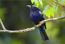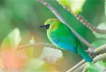 蓝翅叶鹎:小型鸟类,体长15-18厘米。雄鸟通体草绿色,尾蓝绿色,肩和翅亮蓝 色,胸缀有黄色,颏、喉黑色。雌鸟颏,喉蓝绿色。栖息在海拔1500米以下的常绿阔叶林、次生林和林缘疏林灌丛中。…全部>>