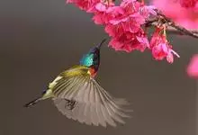黑胸太阳鸟:小型鸟类,体长9-15厘米。嘴细长而向下曲。雄鸟中央尾羽特长,尾呈楔形,头顶至后颈紫蓝色具金属光泽;背褐红色,腰有一黄色横带,尾上覆羽和尾紫蓝色;颏、喉和上胸乌黑色,有的下胸为硫黄色,…全部>>