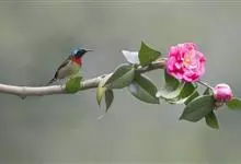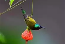 绿喉太阳鸟:共有9个亚种。小型鸟类,雄鸟体长13-15厘米、雌鸟10-12厘米。雄鸟前额至后颈、颏和喉辉绿色,头侧黑色,颈侧和背暗红色,两肩、下背橄榄绿色,腰鲜黄色,尾上覆羽和中央尾羽暗绿色,…全部>>