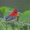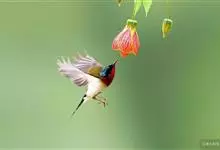 叉尾太阳鸟,雀形目太阳鸟科太阳鸟属留鸟;为小型鸟类,雄鸟头顶辉蓝绿色,上体橄榄绿色,腰明黄色,中央尾羽亮翠蓝色,羽轴针状延长,外侧尾羽黑色具白色端斑,头侧黑色,颜、喉和胸为绛红色,…全部>>