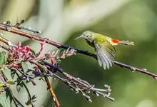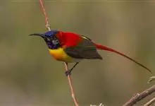 火尾太阳鸟为太阳鸟科太阳鸟属的鸟类。体长20厘米,色彩艳丽。雄鸟红色,具形长的艳猩红色中央尾羽。头顶金属蓝色,眼先和头侧黑色,喉及髭纹金属紫色。下体黄色,胸具艳丽的橘黄色块斑。雌鸟灰橄榄色,腰黄,…全部>>