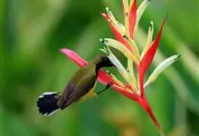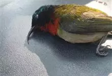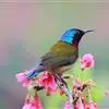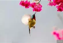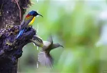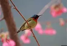 黑胸太阳鸟:小型鸟类,体长9-15厘米。嘴细长而向下曲。雄鸟中央尾羽特长,尾呈楔形,头顶至后颈紫蓝色具金属光泽;背褐红色,腰有一黄色横带,尾上覆羽和尾紫蓝色;颏、喉和上胸乌黑色,有的下胸为硫黄色,…全部>>