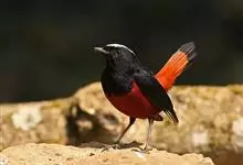 红头咬鹃: 体大,体长约33厘米,体重75-110克。头、颈暗绯红色;背、肩锈褐色。两翅黑色,翅上覆羽和内侧飞羽密被白色细虫蠹斑纹,初级飞羽黑色,外侧具白色羽缘;腰和尾上覆羽较多锈色。中央尾羽深栗色,…全部>>