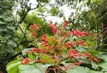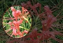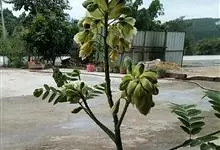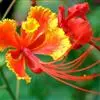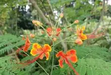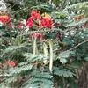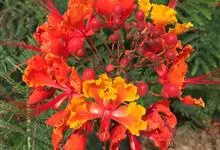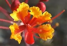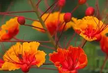 洋金凤 Sw.),豆科小凤花属灌木状或小乔木植物,枝无毛,绿或粉绿色;二回羽状复叶;总状花序伞房状,萼片无毛,花瓣橙红或黄色,圆形,花丝红色,子房无毛,花柱橙黄色;荚果窄而薄,…全部>>