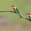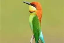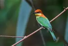绿喉蜂虎是佛法僧目、蜂虎科的小型鸟类,共有9个亚种。身长22-25厘米,翼展29-30厘米,体重15-20克。喉绿色,额部、头顶至上背为锈红色,其余上体均为亮绿色。中央尾羽延长且端段狭细,…全部>>