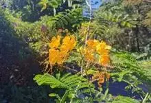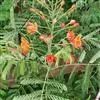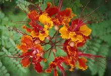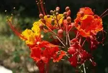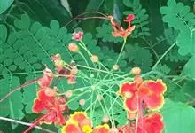 洋金凤 Sw.),豆科小凤花属灌木状或小乔木植物,枝无毛,绿或粉绿色;二回羽状复叶;总状花序伞房状,萼片无毛,花瓣橙红或黄色,圆形,花丝红色,子房无毛,花柱橙黄色;荚果窄而薄,…全部>>
