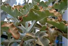 褐斑伽蓝是景天科伽蓝菜属的多年生多肉类植物,茎直立,多分枝,叶生于枝上,肉质叶片匙形,上面密被白色绒毛,下部全缘,叶缘上部有缺刻,缺刻处有深褐或棕色斑块。褐斑伽蓝原产非洲的马达加斯加岛。…全部>>