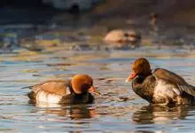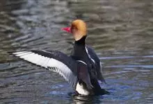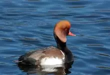 赤嘴潜鸭俗称大红头,是大型鸭类,个体比绿头鸭小,体长45-55厘米,体重1千克左右。雄鸟头浓栗色,具淡棕黄色羽冠。上体暗褐色,翼镜白色,嘴赤红色。下体黑色,两胁白色,特征极明显,野外容易辨别。…全部>>