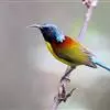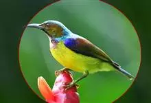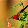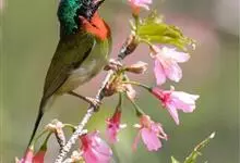 绿喉太阳鸟:共有9个亚种。小型鸟类,雄鸟体长13-15厘米、雌鸟10-12厘米。雄鸟前额至后颈、颏和喉辉绿色,头侧黑色,颈侧和背暗红色,两肩、下背橄榄绿色,腰鲜黄色,尾上覆羽和中央尾羽暗绿色,…全部>>