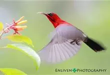 叉尾太阳鸟,雀形目太阳鸟科太阳鸟属留鸟;为小型鸟类,雄鸟头顶辉蓝绿色,上体橄榄绿色,腰明黄色,中央尾羽亮翠蓝色,羽轴针状延长,外侧尾羽黑色具白色端斑,头侧黑色,颜、喉和胸为绛红色,…全部>>