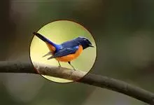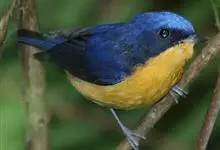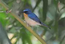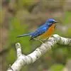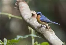 山蓝仙鹟:小型鸟类,体长13-15厘米。雄鸟额基和眼先黑色,颏橙棕色,仅颏尖为蓝黑色,喉、胸、上腹和两胁亦为橙棕色,下体白色范围较小,仅局限于下腹和尾下覆羽。雌鸟上体少黄色,颏、喉、胸概为锈红色,…全部>>