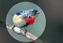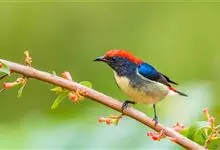 红胸啄花鸟:体重5-10克,体长60-92毫米。体形纤小。雄鸟上体呈辉亮的金属绿色;下体棕黄,胸部具一朱红色块斑,极易与其他啄花鸟区别。雌鸟上体呈橄榄绿,下体棕黄色。虹膜褐色,嘴褐黑色或角灰色,…全部>>