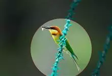 栗喉蜂虎是蜂虎科蜂虎属的鸟类。有热带鸟类羽毛艳丽的特征:喉部是栗红色的,黑色的过眼纹,翅膀和背部是绿色的,尾翼是蓝色的,飞行时翅膀下面的羽毛是橙黄色的,在阳光的照射下,它们全身闪烁着金属般的艳丽光泽,…全部>>