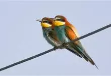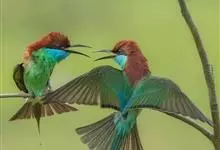 栗喉蜂虎是蜂虎科蜂虎属的鸟类。有热带鸟类羽毛艳丽的特征:喉部是栗红色的,黑色的过眼纹,翅膀和背部是绿色的,尾翼是蓝色的,飞行时翅膀下面的羽毛是橙黄色的,在阳光的照射下,它们全身闪烁着金属般的艳丽光泽,…全部>>