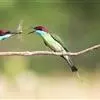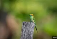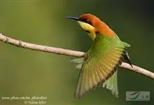 绿喉蜂虎是佛法僧目、蜂虎科的小型鸟类,共有9个亚种。身长22-25厘米,翼展29-30厘米,体重15-20克。喉绿色,额部、头顶至上背为锈红色,其余上体均为亮绿色。中央尾羽延长且端段狭细,…全部>>
