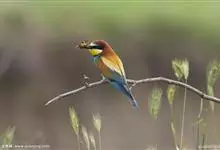 栗喉蜂虎是蜂虎科蜂虎属的鸟类。有热带鸟类羽毛艳丽的特征:喉部是栗红色的,黑色的过眼纹,翅膀和背部是绿色的,尾翼是蓝色的,飞行时翅膀下面的羽毛是橙黄色的,在阳光的照射下,它们全身闪烁着金属般的艳丽光泽,…全部>>