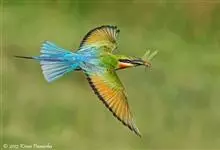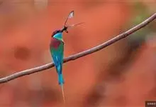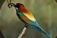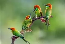 栗喉蜂虎是蜂虎科蜂虎属的鸟类。有热带鸟类羽毛艳丽的特征:喉部是栗红色的,黑色的过眼纹,翅膀和背部是绿色的,尾翼是蓝色的,飞行时翅膀下面的羽毛是橙黄色的,在阳光的照射下,它们全身闪烁着金属般的艳丽光泽,…全部>>