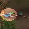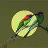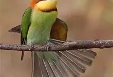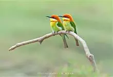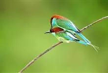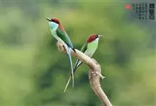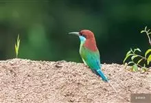 栗喉蜂虎是蜂虎科蜂虎属的鸟类。有热带鸟类羽毛艳丽的特征:喉部是栗红色的,黑色的过眼纹,翅膀和背部是绿色的,尾翼是蓝色的,飞行时翅膀下面的羽毛是橙黄色的,在阳光的照射下,它们全身闪烁着金属般的艳丽光泽,…全部>>
