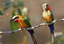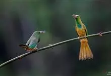 蓝喉蜂是蜂虎科蜂虎属鸟类。体长26-28厘米,嘴长而弯曲,有明显细长的中央尾羽。头部、颈部和背部为巧克力色,有黑色眼纹。喉部、腰部和尾羽为蓝色。腹部和两翼为绿色。幼鸟外观似成鸟,头部、颈部和背部为绿色,…全部>>
