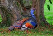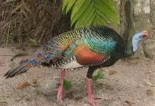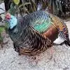 眼斑吐绶鸡:是火鸡科的两种鸟类之一。体型比普通火鸡略小些,体长1米左右,体重2.4-5.4千克,雄性比雌性略大,长得很特别,蓝色的秃脑袋上冒出几个橙黄色的疙瘩。但是它羽色艳丽,身体呈铜色及绿色。…全部>>