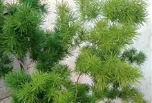 蓬莱松是天门冬科、天门冬属多年生丛生草本植物。宿存,圆柱形肉质根,纵截面为绿色和表面灰色。植株高可达3米。茎呈圆柱形或近四边形,底部木质化,具有灰色或灰褐色。幼嫩的茎在每个节上都被紫绿色鳞片包,…全部>>