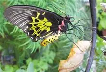 金裳凤蝶是凤蝶科、裳凤蝶属的动物。金裳凤蝶身体呈黑色,头、颈和胸侧有红毛,腹部有黑黄两色相间条纹,雄蝶前翅黑色,具黑天鹅绒光泽,各脉两侧灰白色,后翅金黄色,各室外缘有等腰三角形黑斑1枚,斑内侧有晕,…全部>>