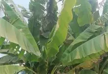 香蕉’),芭蕉科芭蕉属多年生草本植物,植株丛生,有匐匍茎;假茎浓绿有黑色斑点;叶片长圆形,上面为深绿色,无白粉,下面浅绿色;花朵为乳白色或淡紫色;果实呈弯曲的弓状,有棱,果皮为青绿色,…全部>>