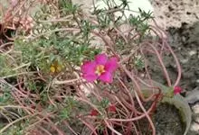 大花马齿苋:一年生草本,高10-30厘米。茎平卧或斜升,紫红色,多分枝,节上丛生毛。叶密集枝端,较下的叶不规则互生,叶片细圆柱形,无毛。花单生或数朵簇生枝端,直径2.5-4厘米,…全部>>