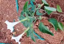 洋金花是茄科曼陀罗属植物,一年生草本植物,全株近于无毛。茎直立,圆柱形,高30~100cm,基部木质化,上部呈义状分枝。叶互生,上部的叶近于对生;叶柄长2~6cm,表面被疏短毛;叶片卵形、长卵形或心形,…全部>>