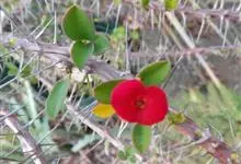 铁海棠为大戟科大戟属蔓生灌木植物;茎多分枝,具纵棱,呈旋转状;叶互生,通常集中于嫩枝上;每个花序基部边缘具微小的红色尖头;苞叶先端圆且具小尖头,无柄,上面鲜红色,下面淡红色;苞片丝状;子房光滑无毛,…全部>>